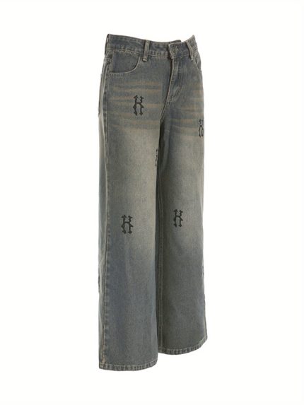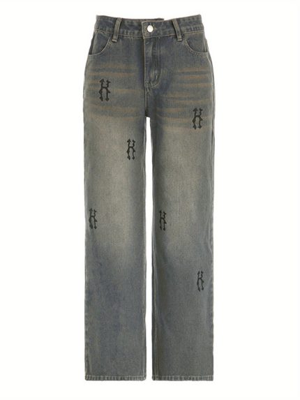 Women’s Retro Letter Print Wide Leg Jeans – Straight-Leg Denim Pants with Multiple Pockets, All-Season Casual Comfort, Machine Washable, Comfortable Fashion, Durable Fabric, Everyday Fashion, Vintage Style, Quality Stitching, Printed Denim, Streetwear Fans