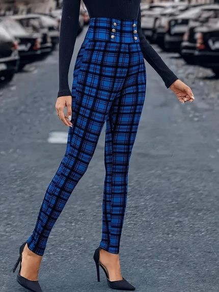 Women’ High-Waisted Slim-Fit Pants with Plaid – Stretchable Trousers Suitable for All-Season Wear, Machine Washable Elegant Button Closure (No Actual Buttons) – Tight-Fitting for Casual & Dressy Outfits – Adult Women’ Clothing