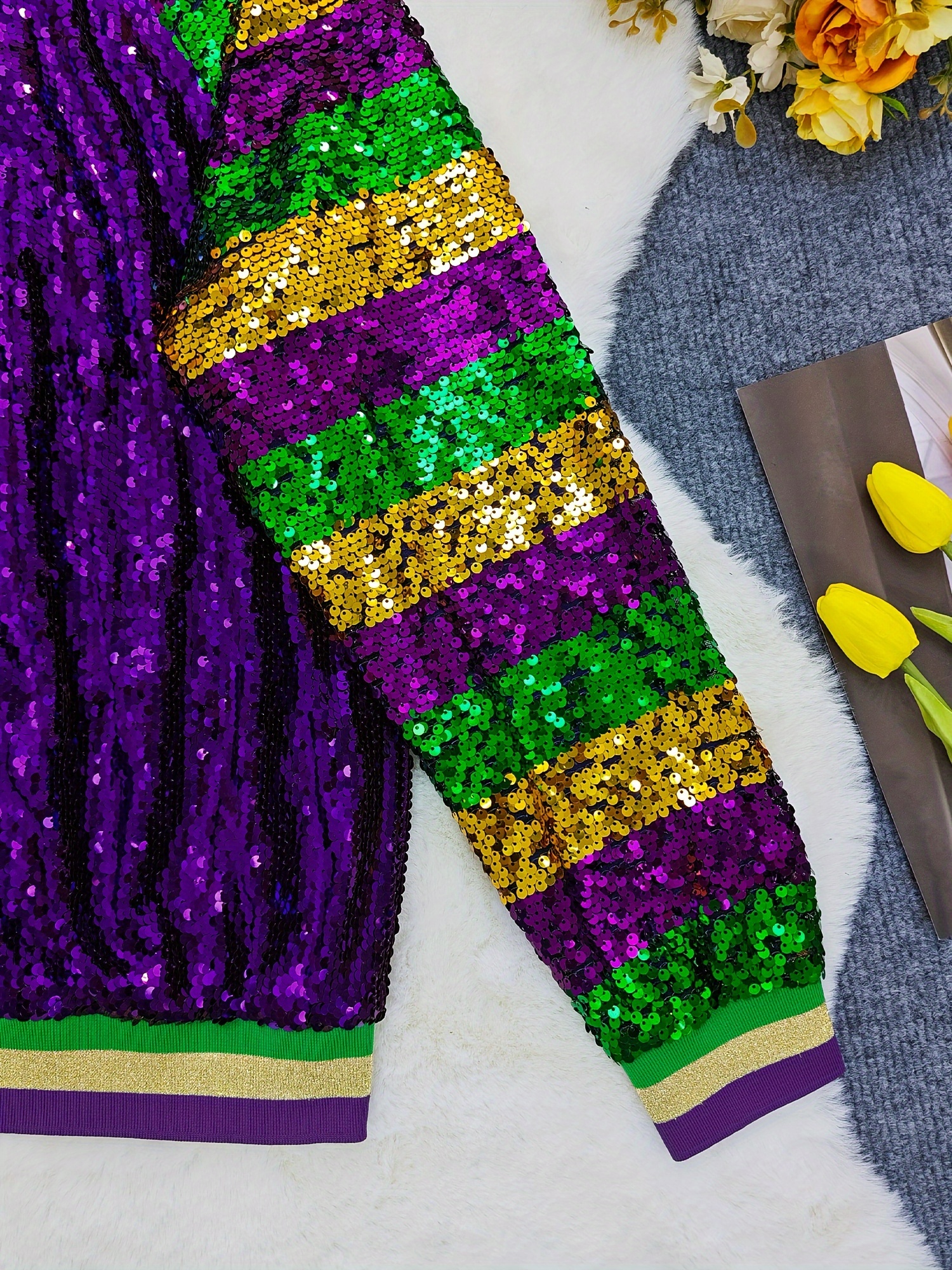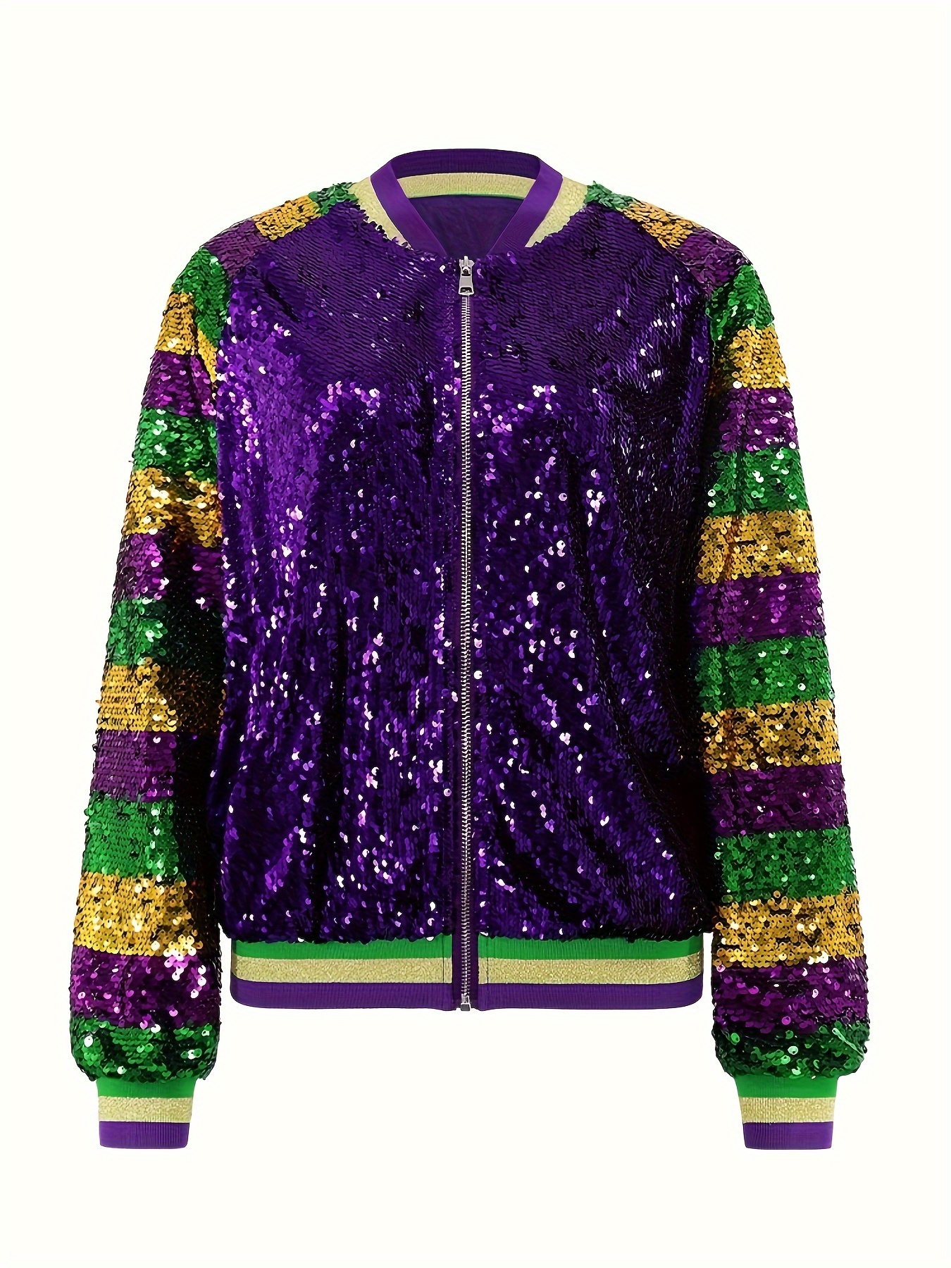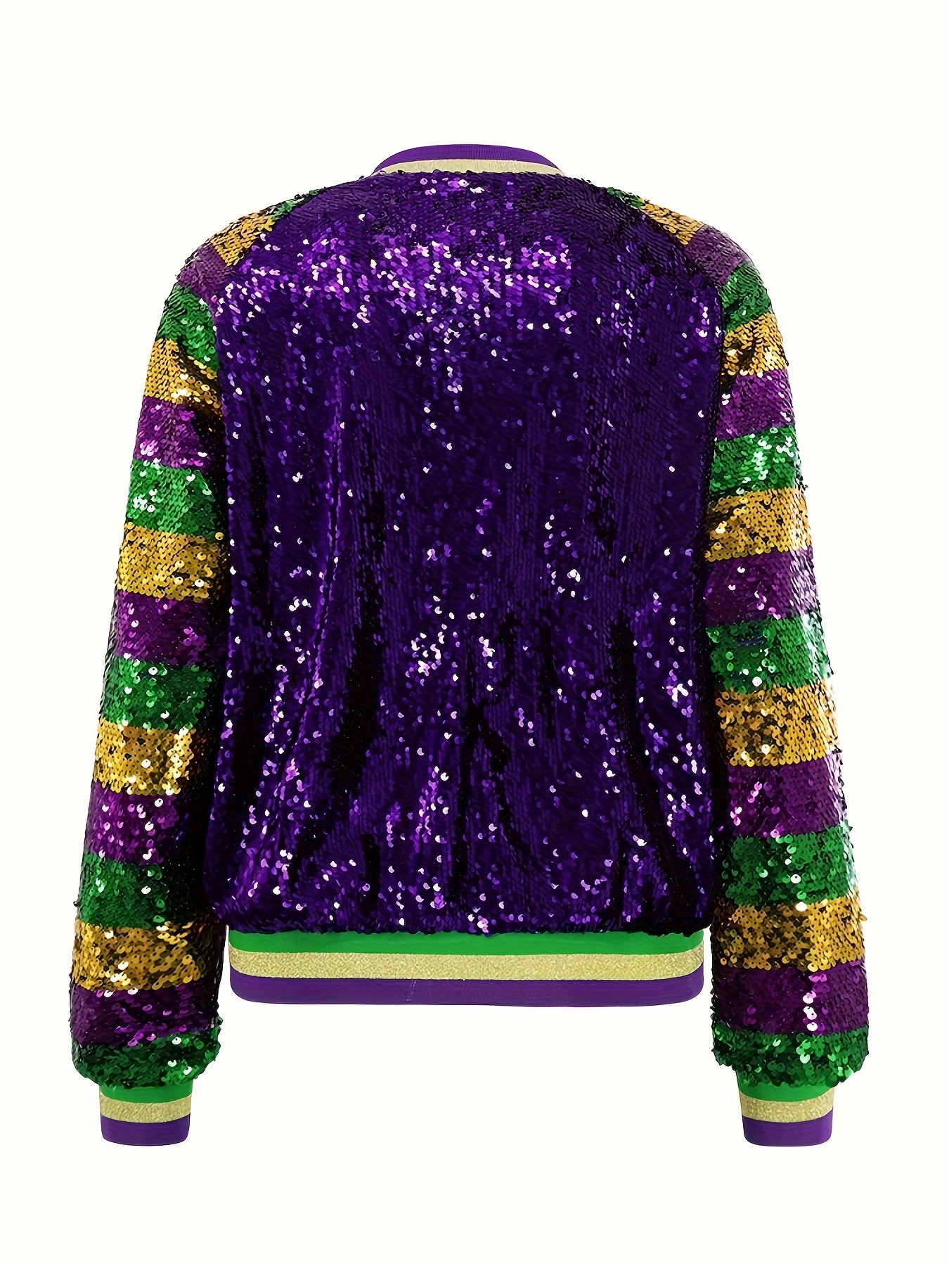 Glittery Sequin Jacket Glittery Sequin Jacket – Vibrant Purple, Green & Golden, Ribbed Cuffs, Long Sleeve, Button-Up Front, Perfect for Fallu002FWinter | Women’s Casual Outerwear