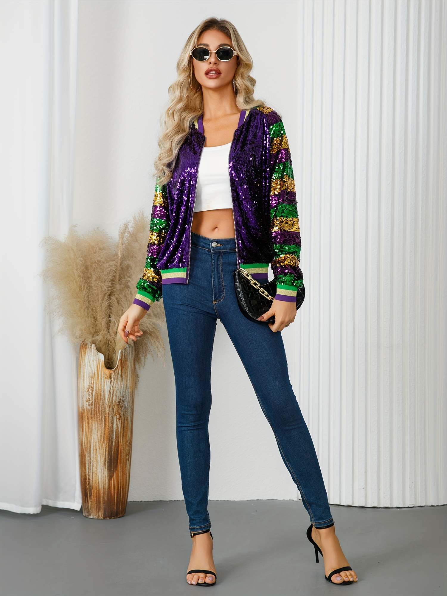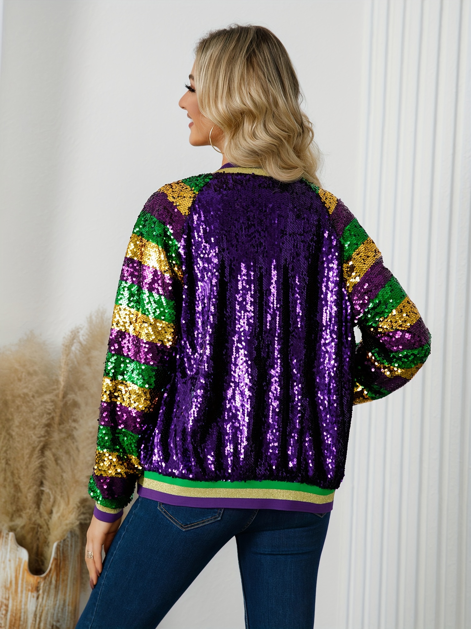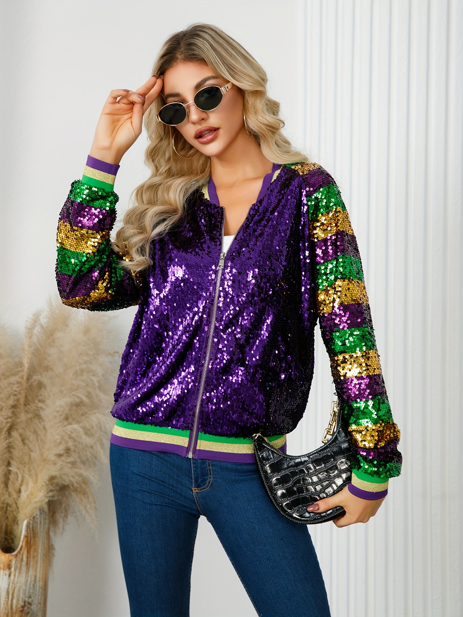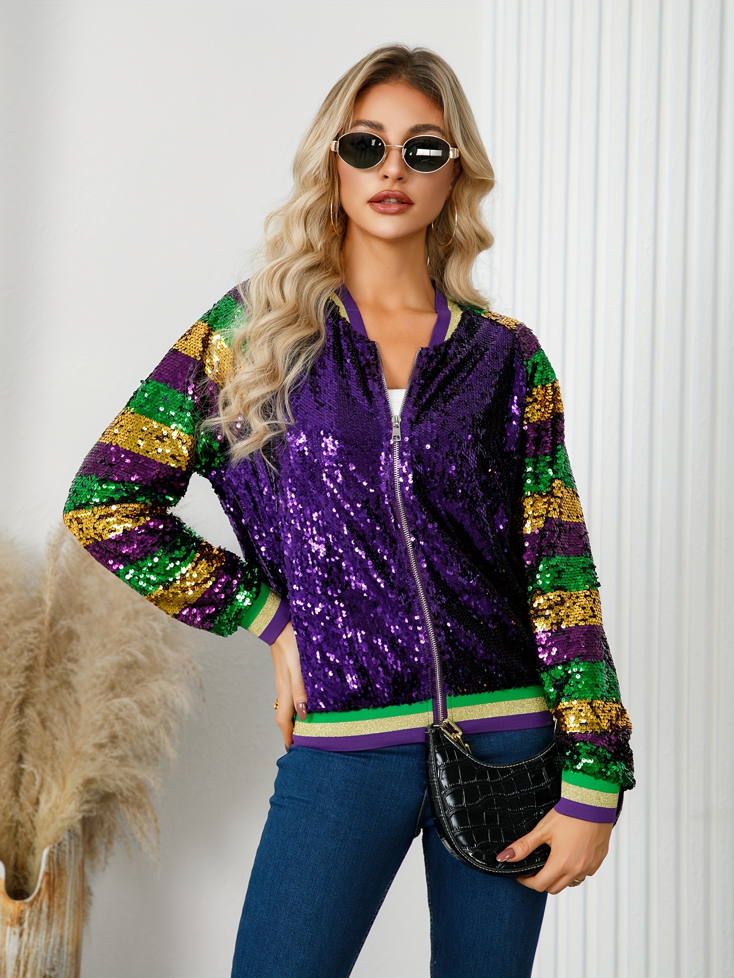 Glittery Sequin Jacket Glittery Sequin Jacket – Vibrant Purple, Green & Golden, Ribbed Cuffs, Long Sleeve, Button-Up Front, Perfect for Fallu002FWinter | Women’s Casual Outerwear