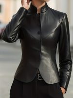 European and American Cross-Border Fashion Elegant Women’s Solid Color Stand Collar Long Sleeve Waist-Cinching Slim-Fit Top Coat, Women’s Autumnu002FWinter Holiday Party Temperament PU Jacket