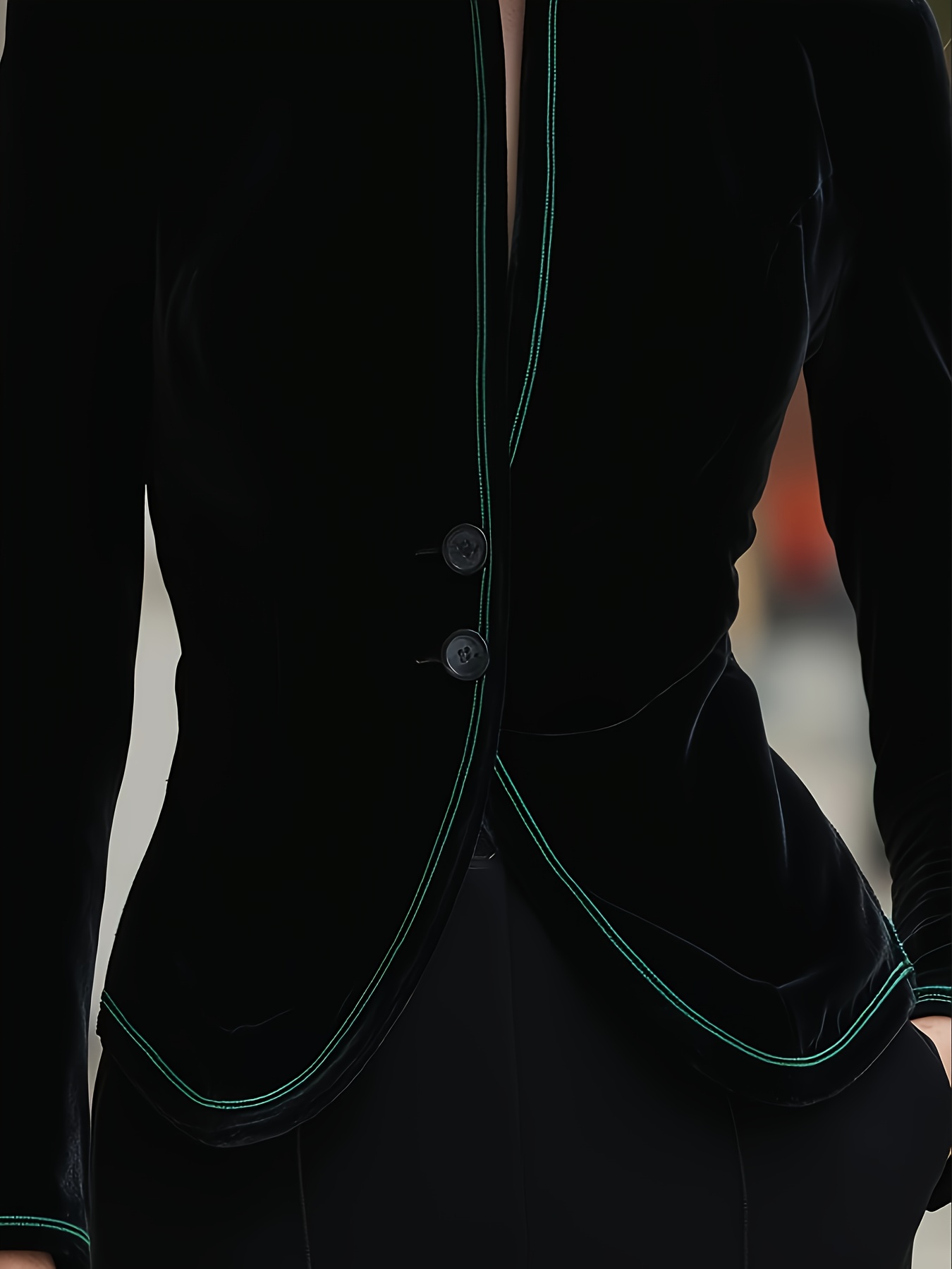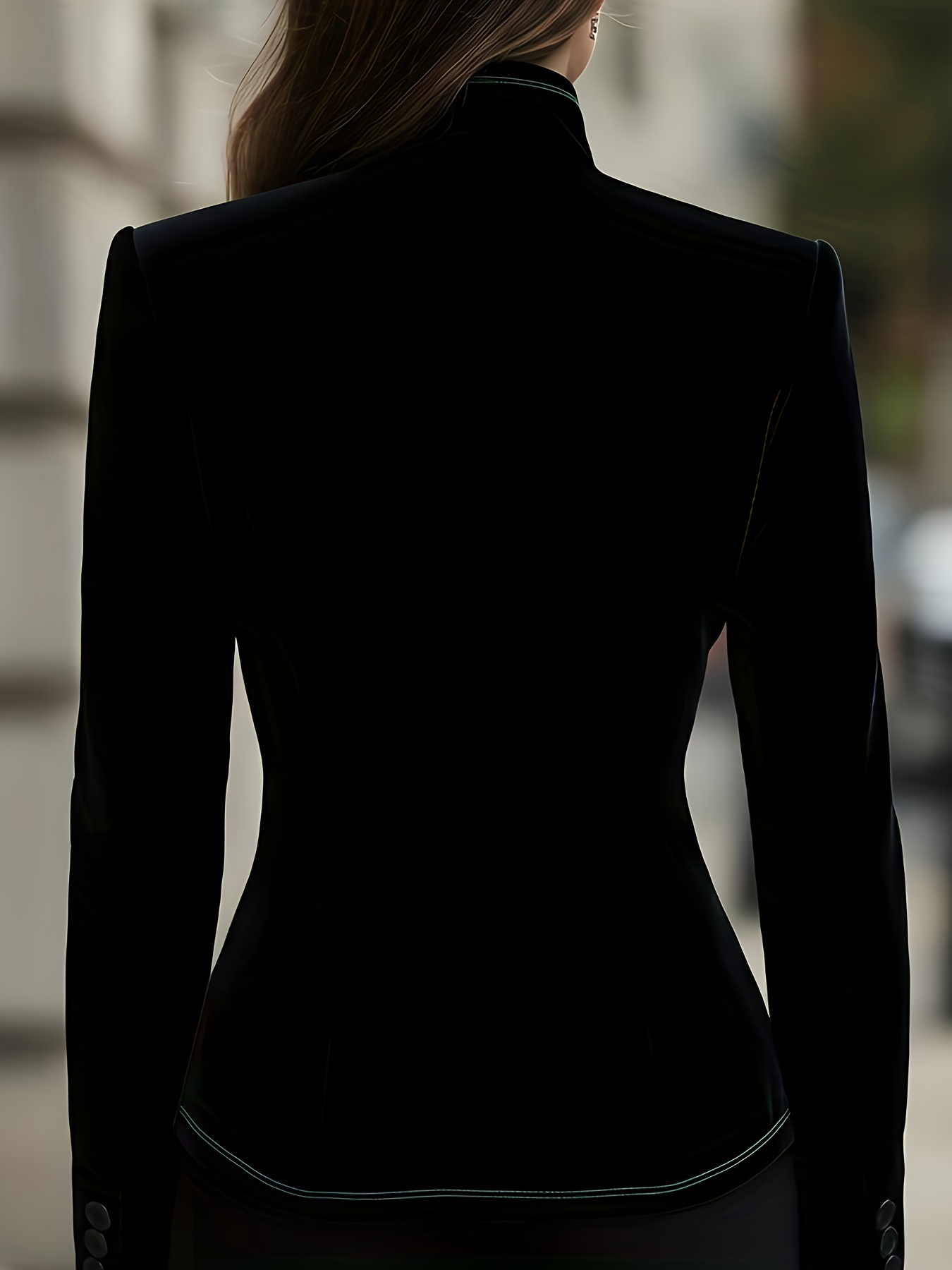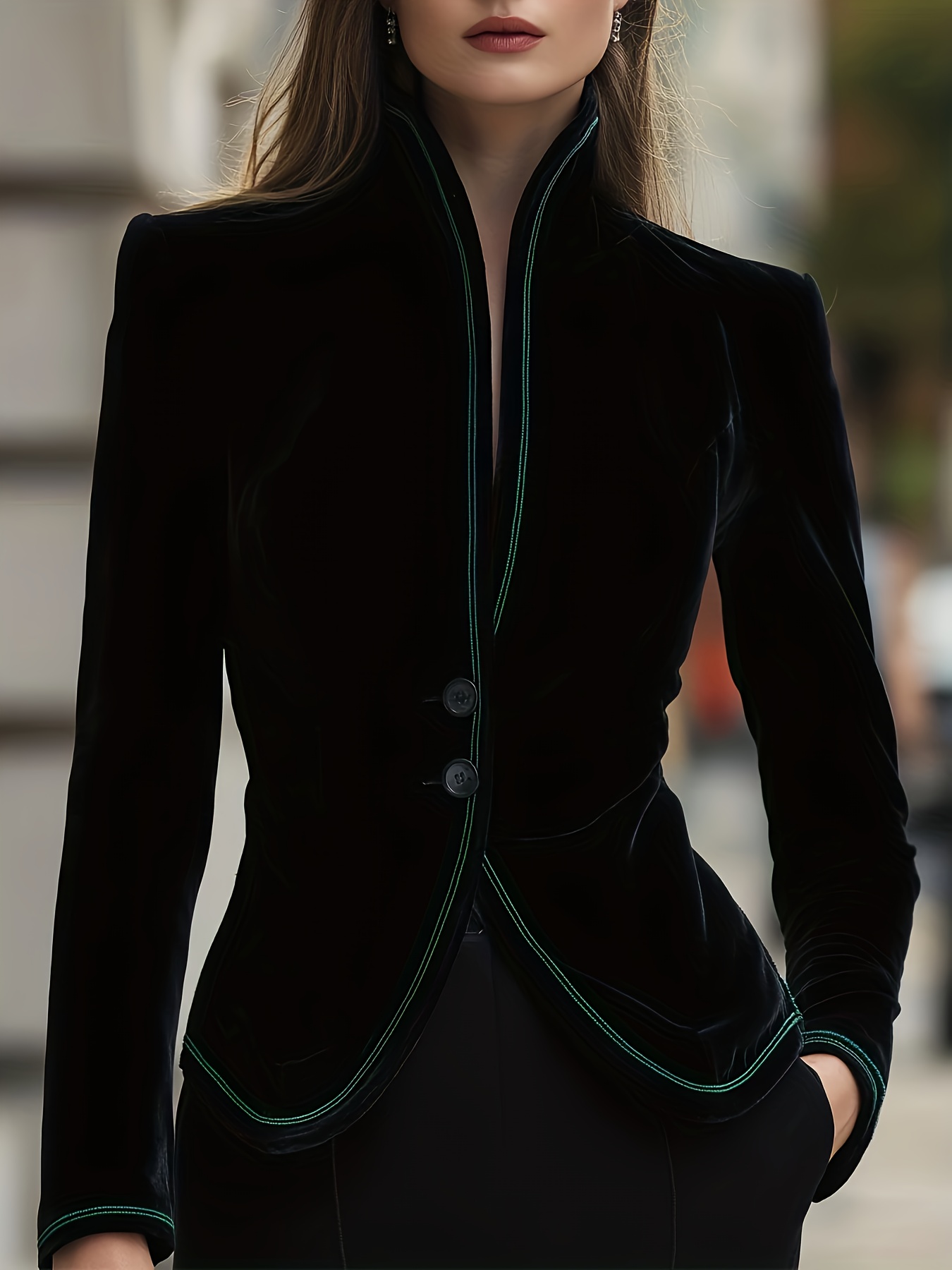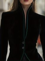 Be the first to review “New Black Velvet Color-Blocked Stylish Commuting Coat with a Stand Collar And Long Sleeves, Featuring Buttoned Front, Suitable for Spring And Autumn” Cancel reply