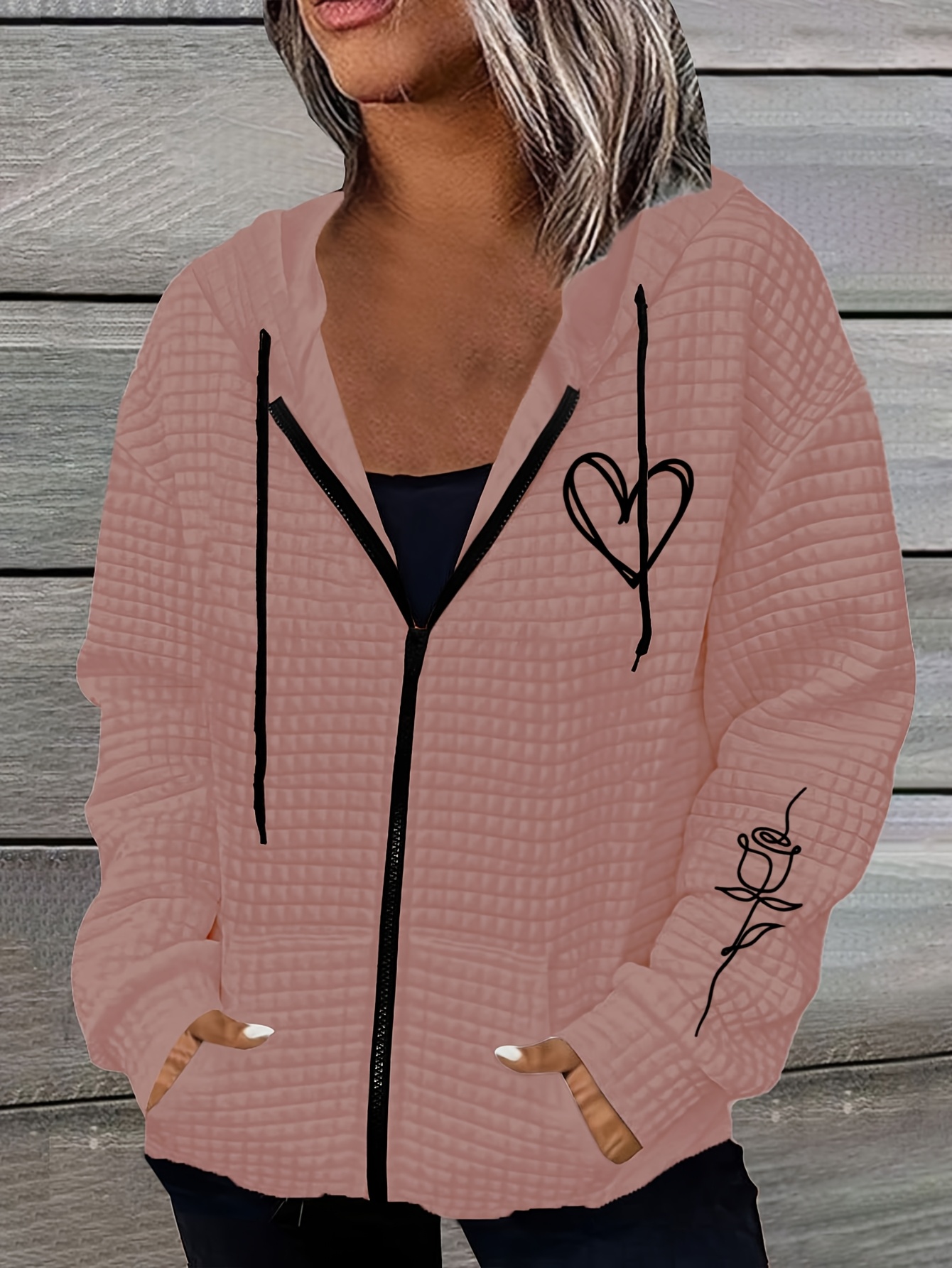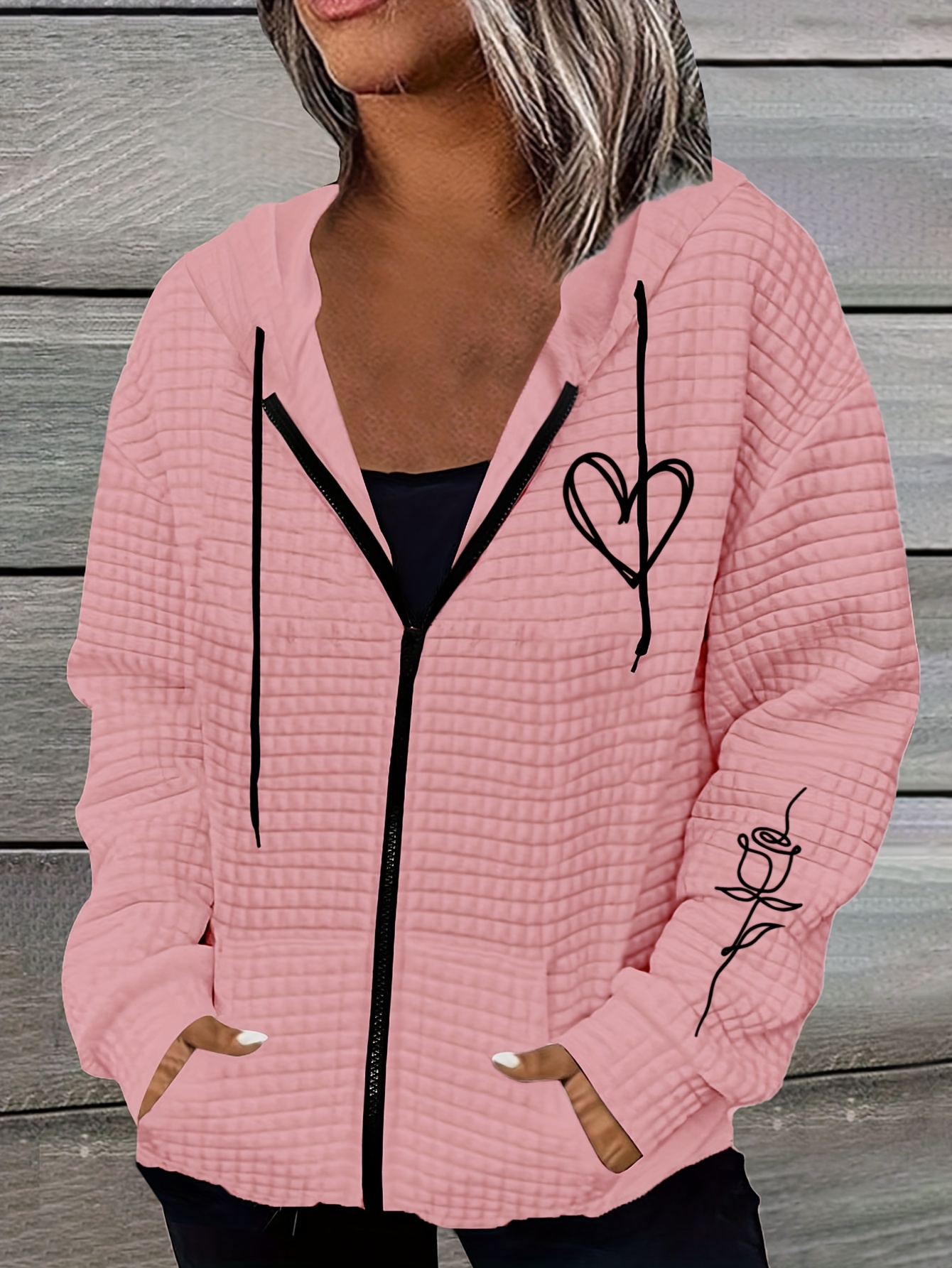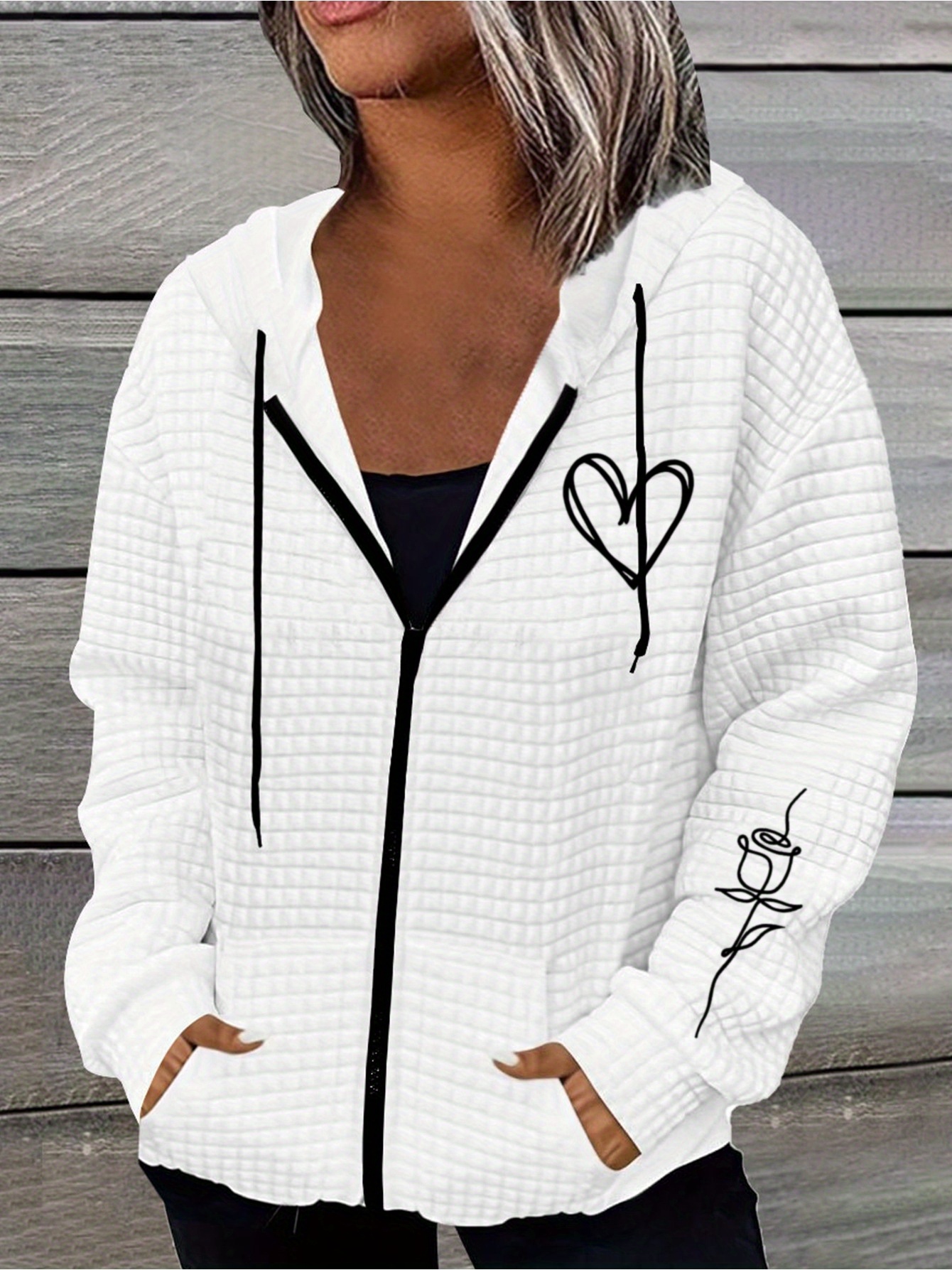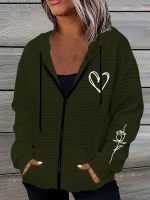 Home Women's Coats & Jackets Rose Hooded Sweater Lightweight Stretchy Polyester Women’s Rose & Heart Print Hooded Sweater Jacket | Kangaroo Pocket, All-Season Casual Outerwear with Ribbed Cuffs
