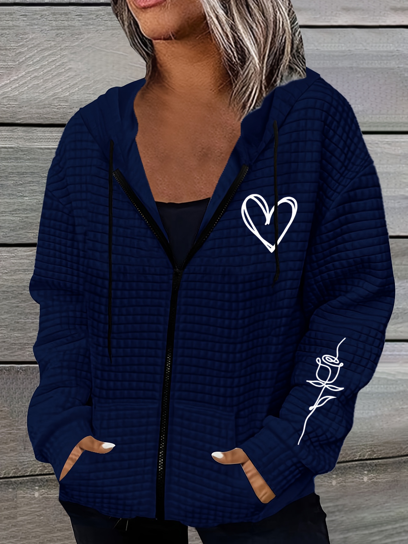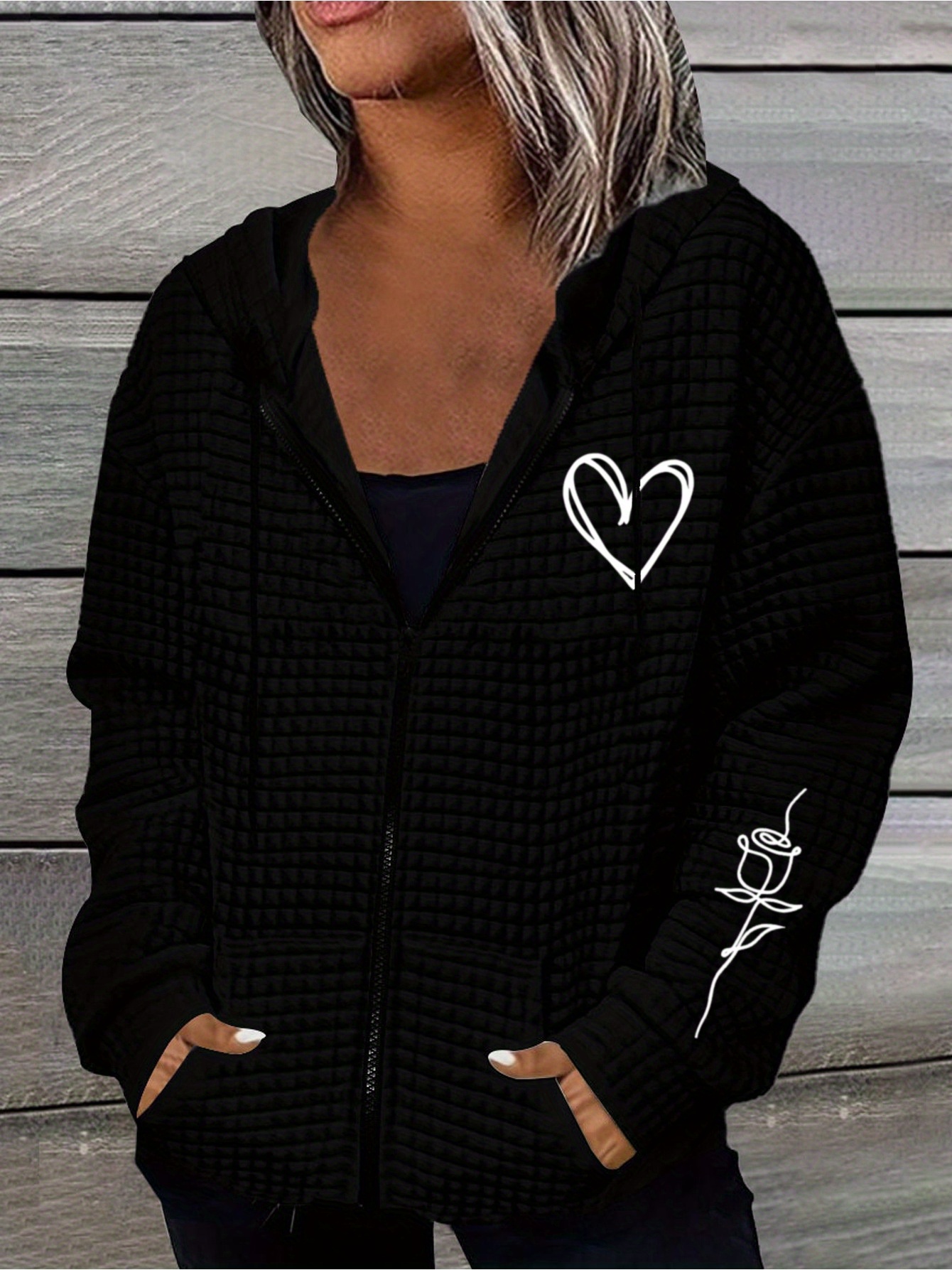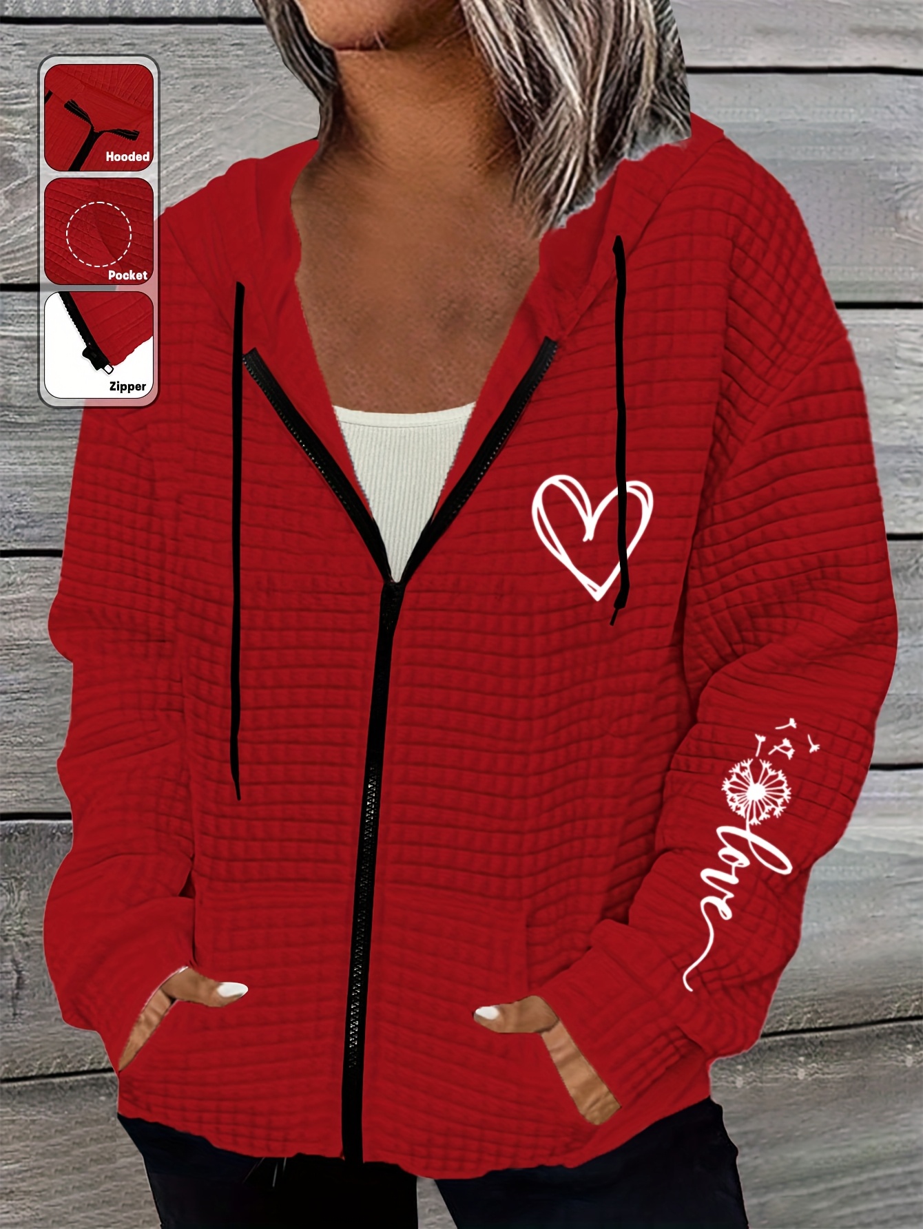Home Women's Coats & Jackets Rose Hooded Sweater Lightweight Stretchy Polyester Women’s Rose & Heart Print Hooded Sweater Jacket | Kangaroo Pocket, All-Season Casual Outerwear with Ribbed Cuffs