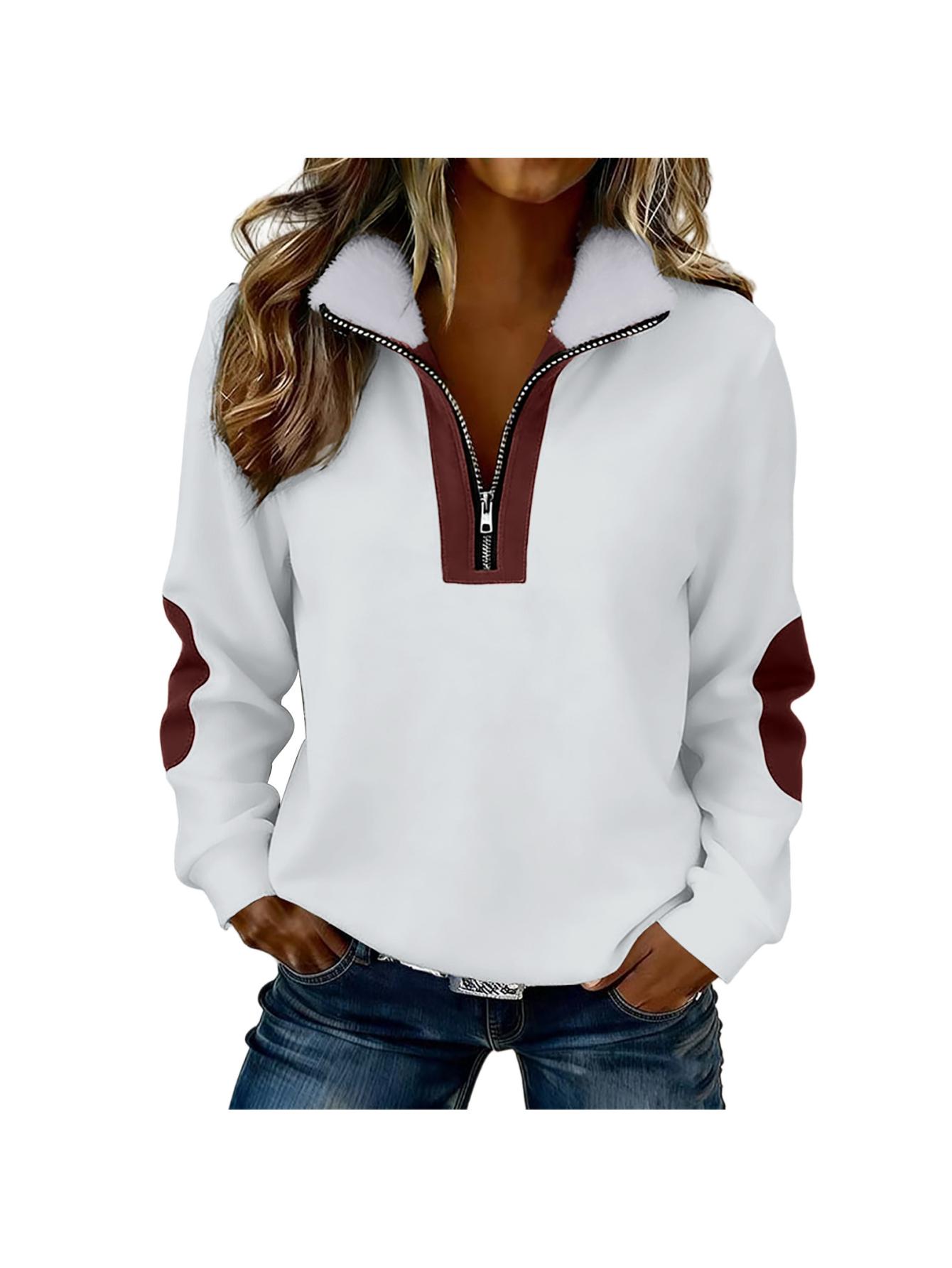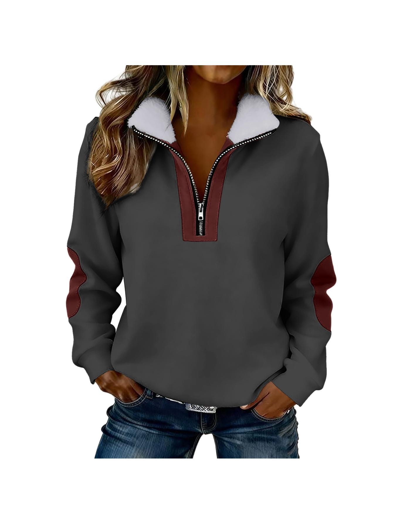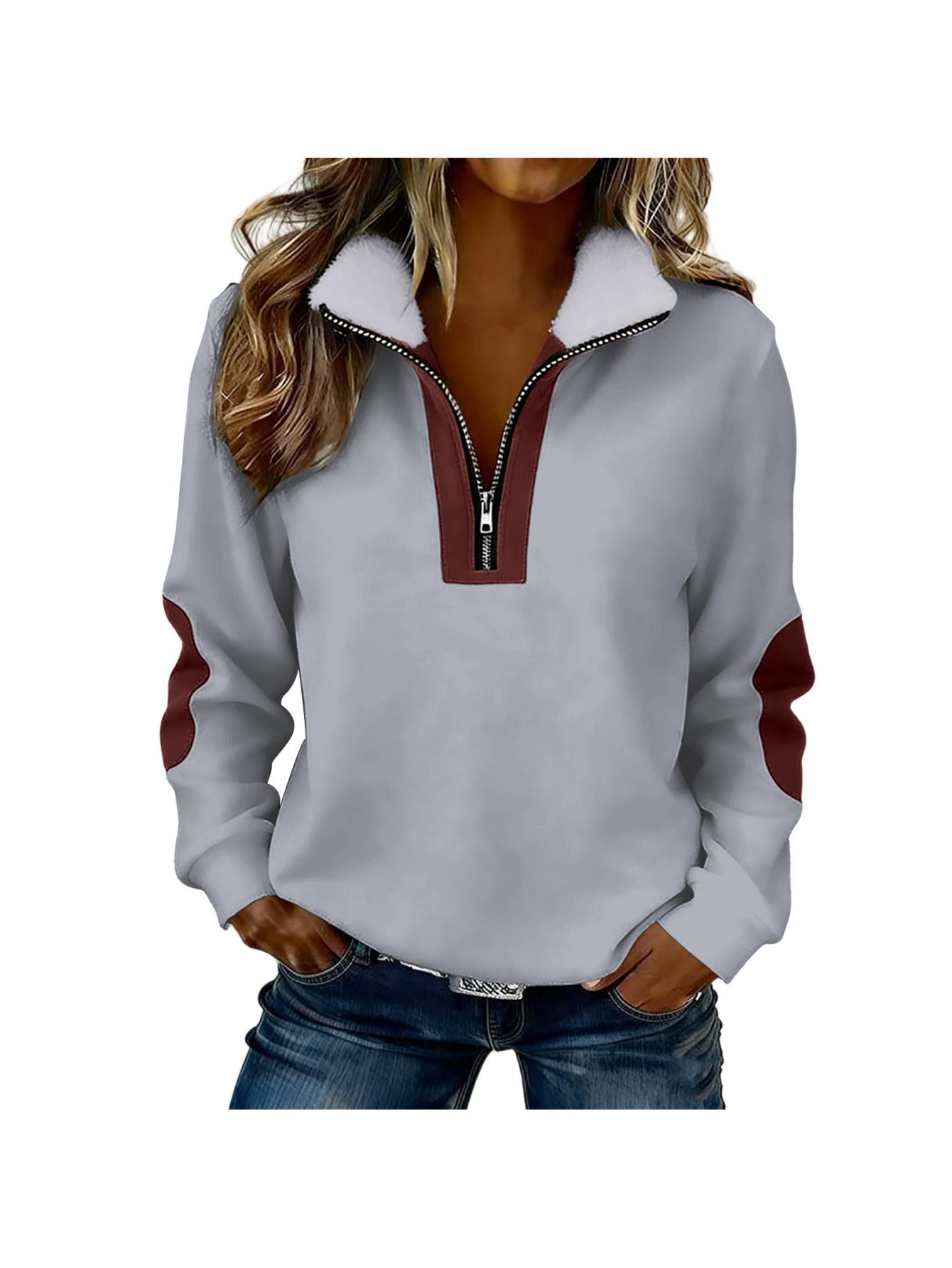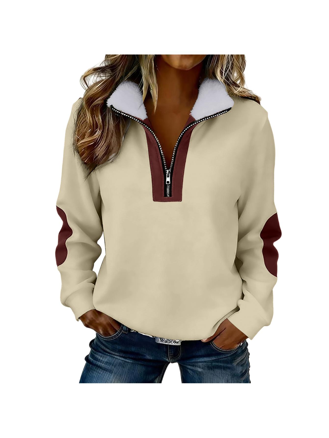Home Women's Sweatshirts Women’S Color Blocked Half-Zip Long-Sleeve Fuzzy Collared Casual Sweatshirt Jacket | Spring & Autumn Warm Clothing, Non-Stretch Fabric, Solid Color, Zipper Detail