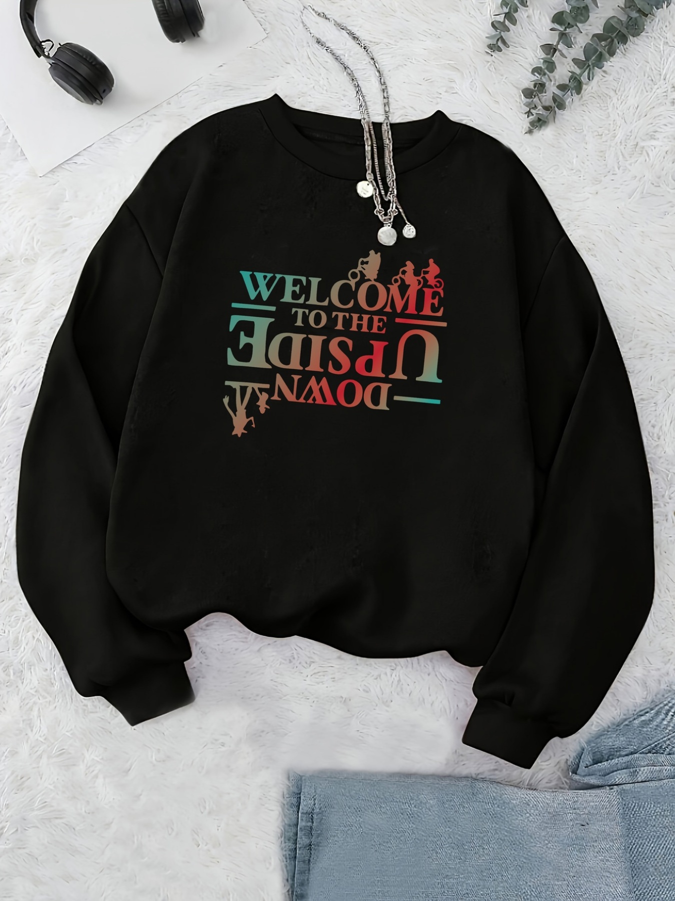 Women’s Fashion Sweatshirt, Welcome to the Upside- World Printed Women’s Casual Autumnu002FWinter Pullover with Round Neck and Long sleeves, Unique Design for Outdoor Wear