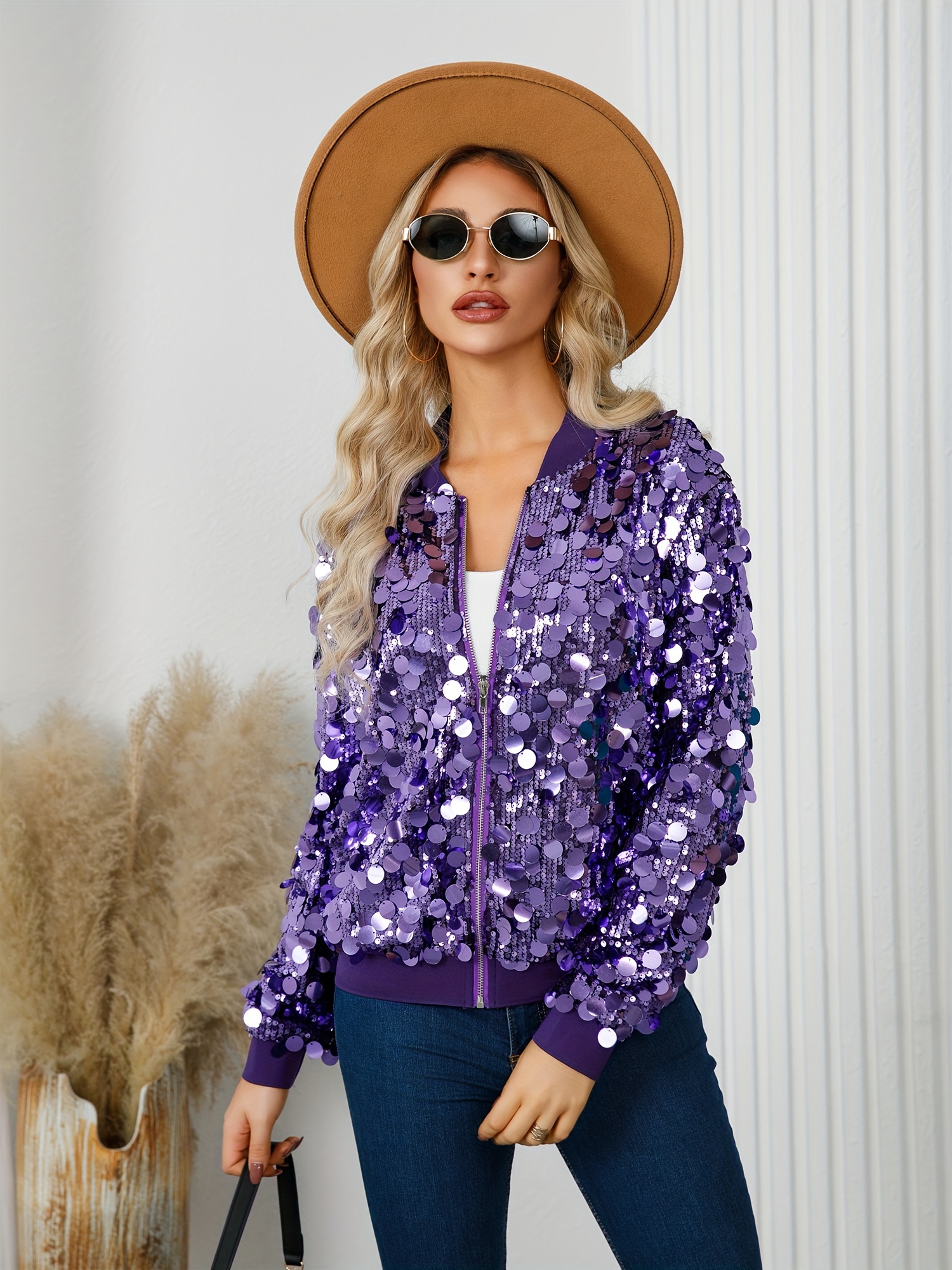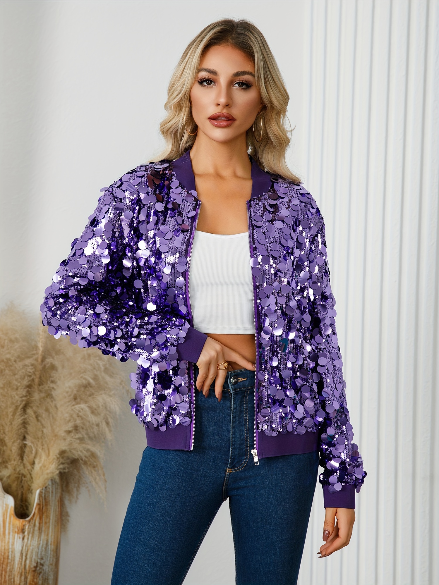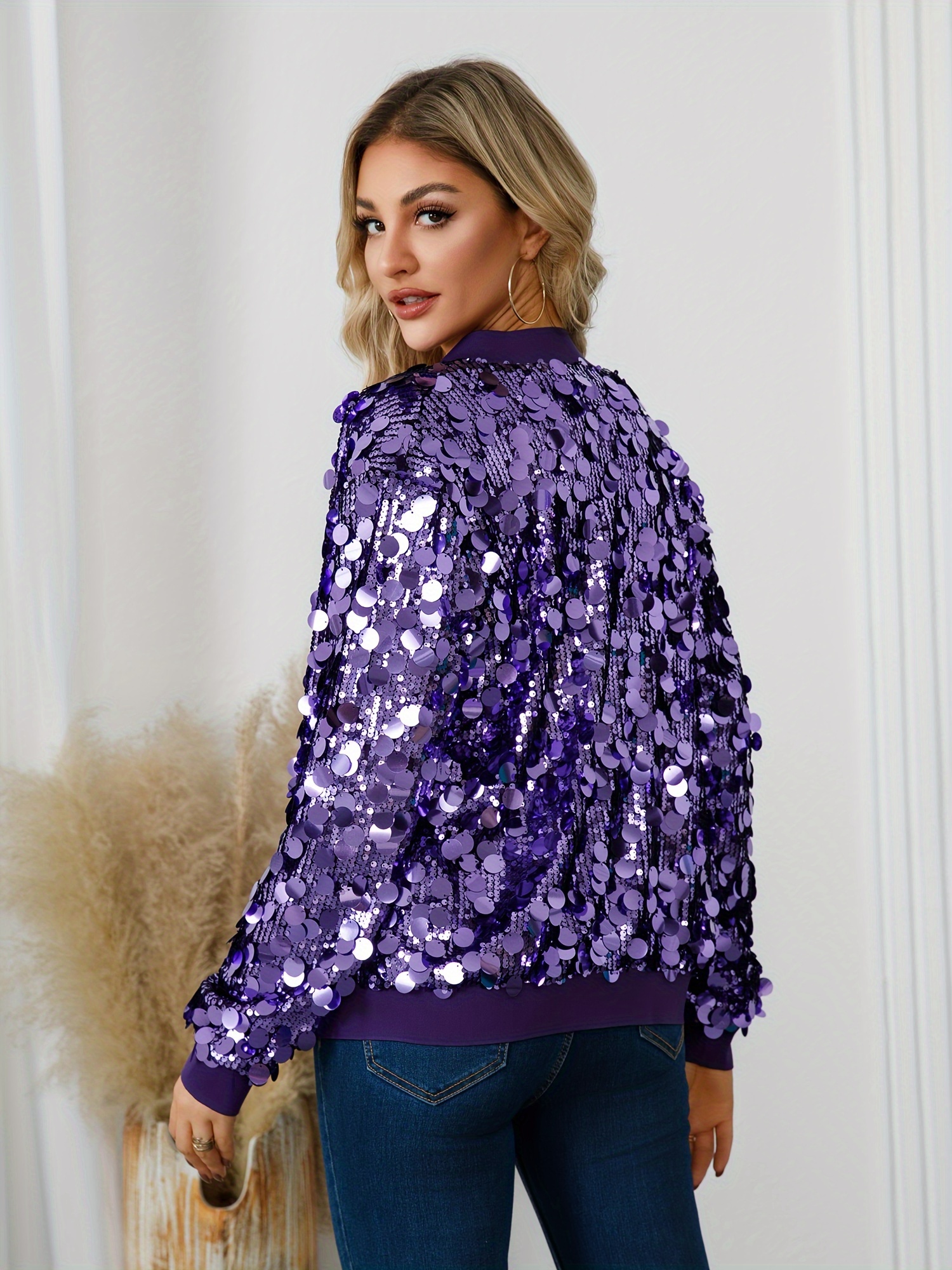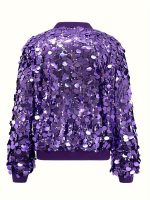 Women’S Sparkling Purple Sequin Jacket – Winter Party & Everyday Outerwear Coat with Shimmering Effect, Round Neck Non-Bulky Design for Formal Events, Night Out, Office – Fallu002FWinter Jacket (A10545A), Ladies Winter Coats, Evening Wear, Sleek Fabric, Stylish Coat, Fashion Lovers, Cold Weather Wear, Durable Construction, Fashionforward Women, Fall Fashion, Highquality Stitching, Fashionconscious Women