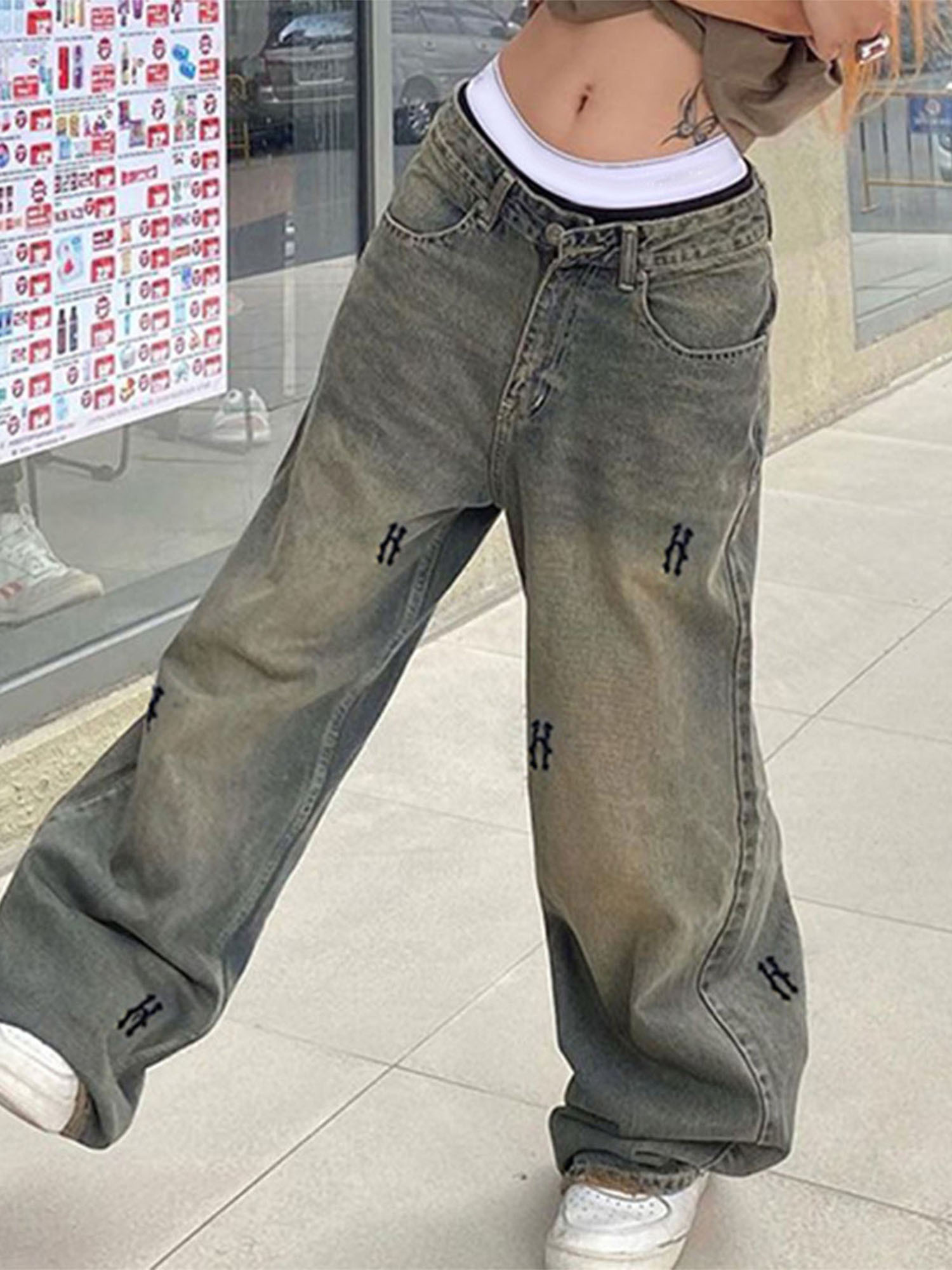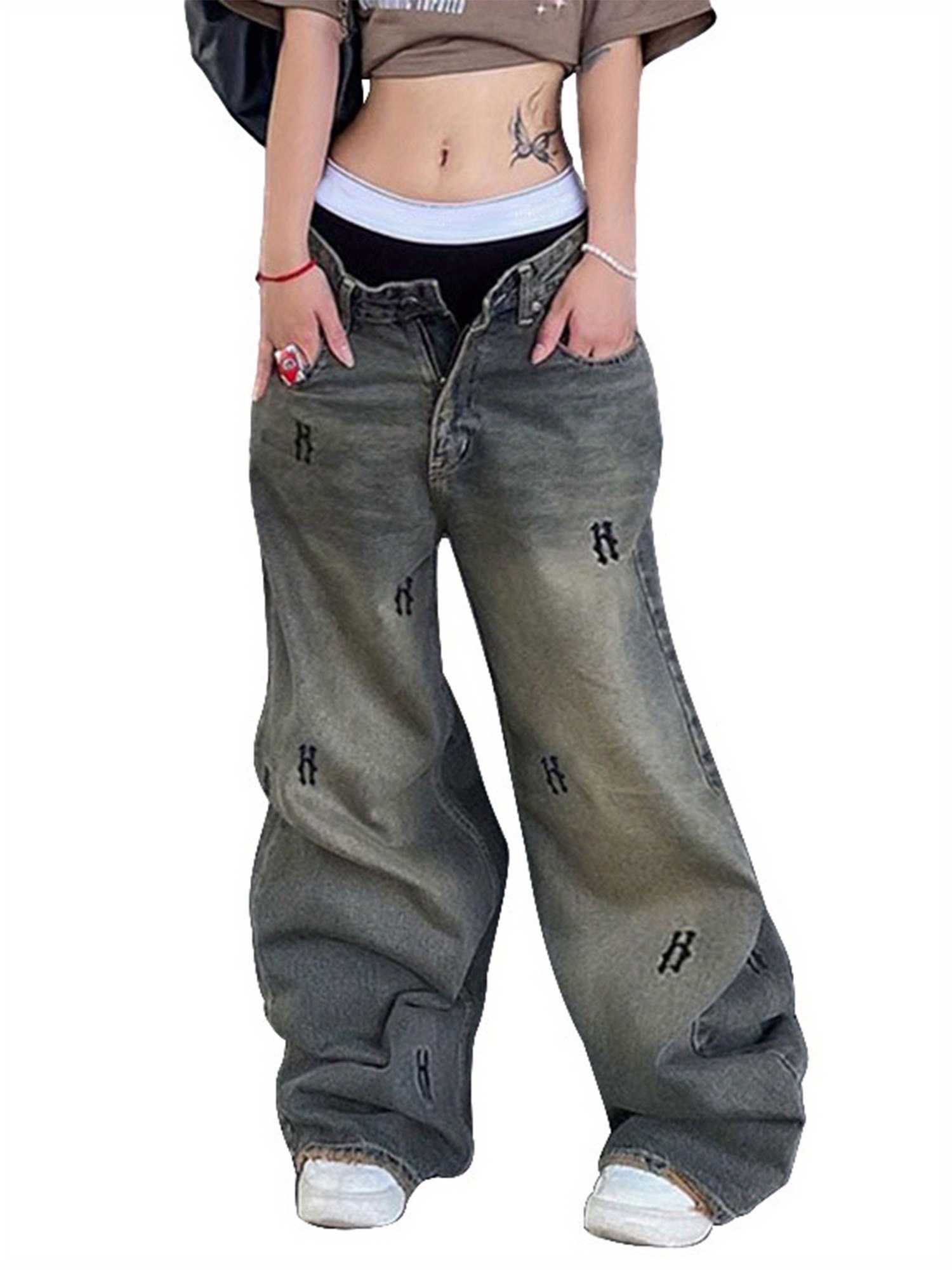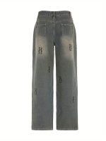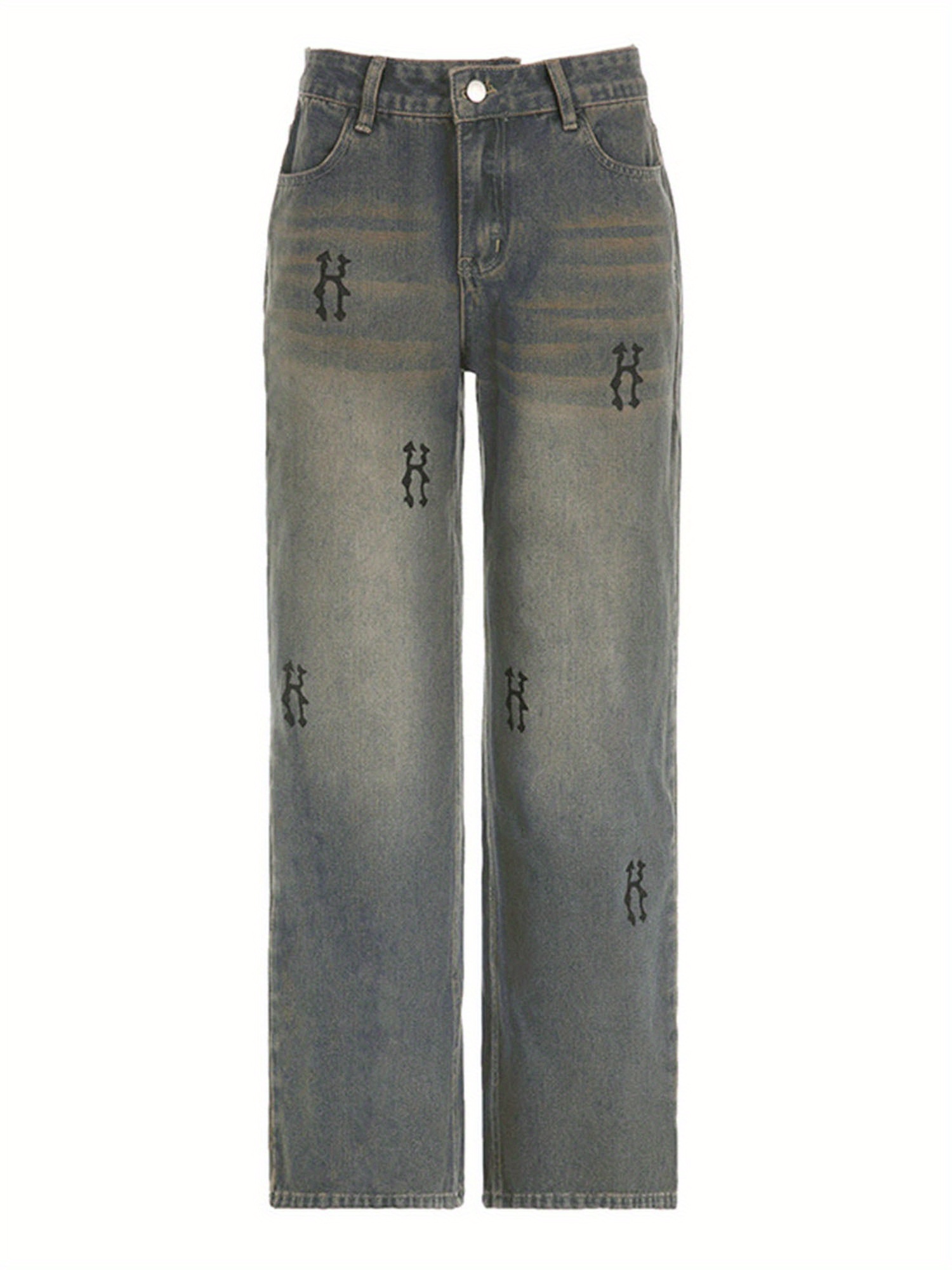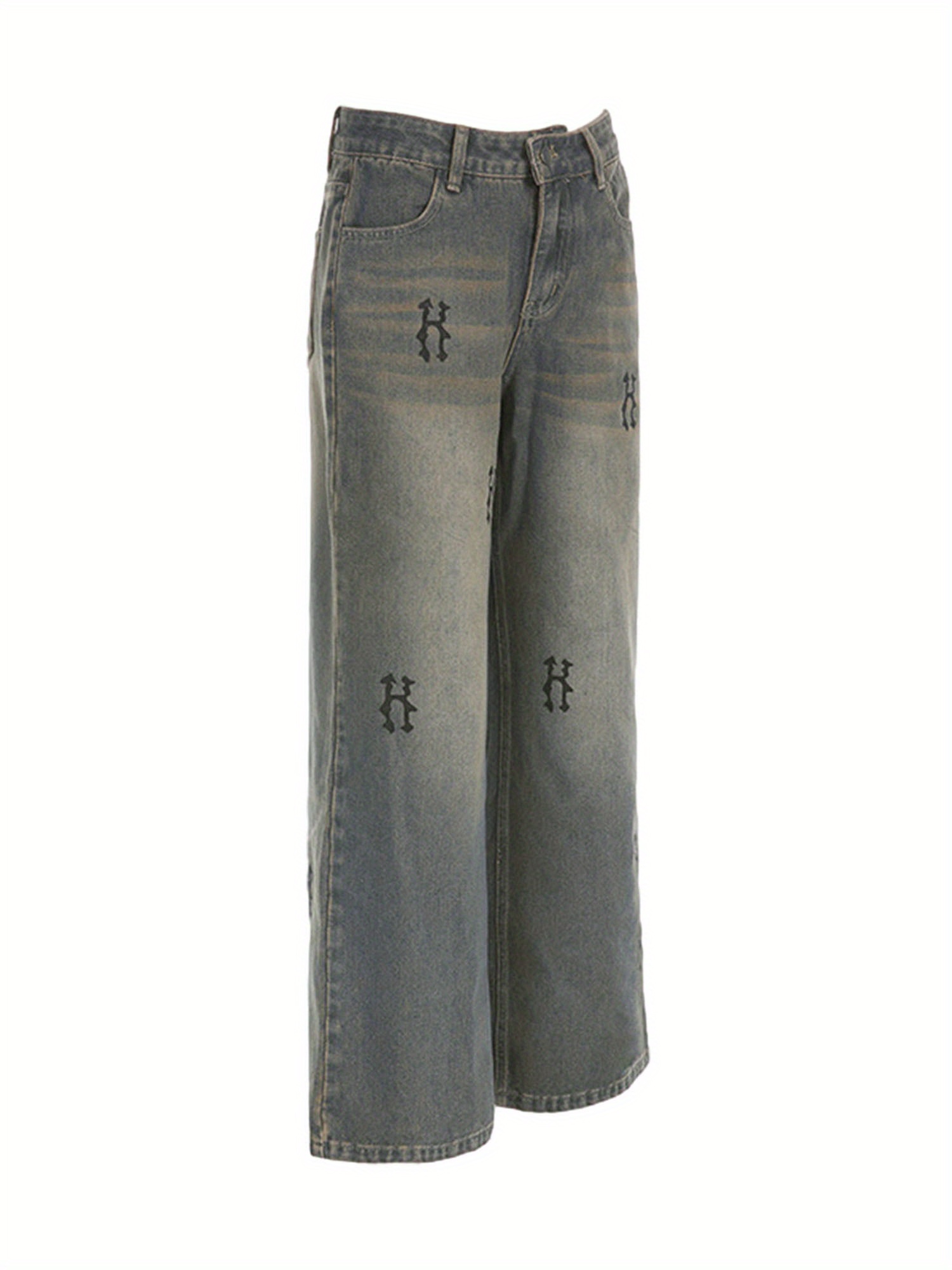 Women’S Spring Summer Casual Denim Pants Retro Letter Print Wide Leg Jeans with Pockets