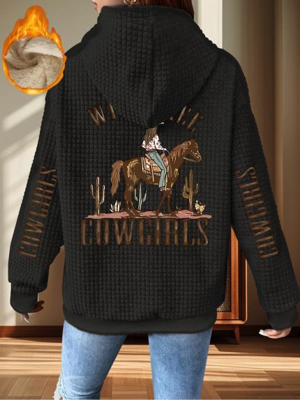 Women’s Western Cowgirl Print Thick Jacket, Cowhide-Like Texture-like Pattern, Zippered Pockets & Cowgirl Motifs, Warm Outerwear for Fall & Winter, Machine Washable Winter Coat (Polyester)